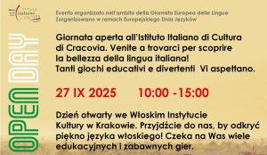 Scopri la bellezza della lingua italiana! In occasione della Giornata Europea delle Lingue, l’Istituto Italiano di Cultura di Cracovia apre le sue porte per un Open Day speciale. Vi aspettiamo il 27 settembre 2025, dalle 10:00 alle 15:00, con tante attività educative, giochi divertenti e momenti per immergersi nella cultura e nella lingua italiana. Non […]